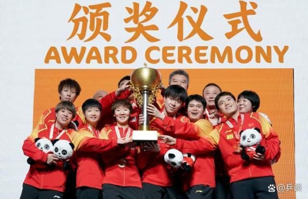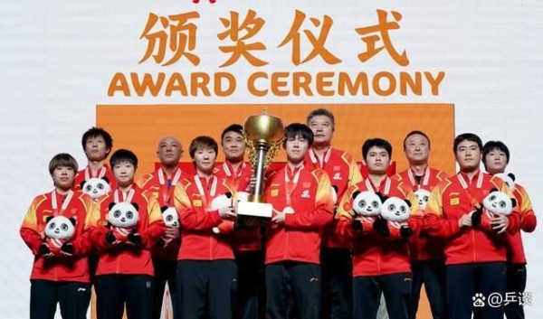 颁奖仪式上,王楚钦和王曼昱占据C位,两个人是核心,捧起金杯,其余所有教练员和运动员手捧小熊猫,围在一起进行大合影。