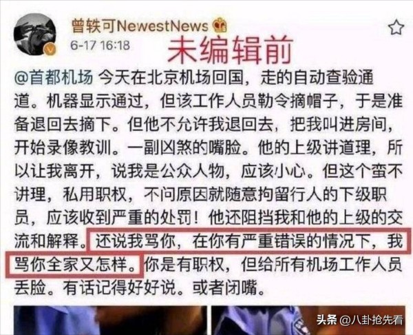 然而,曾轶可并不是唯一一个如此嚣张的明星。毛俊杰的机场事件也曾轰动一时。作为公众人物,她本应更有风度,但她却利用自己的身份制造了一场闹剧。当时,她以宝妈的身份抱怨机场工作人员对她的检查过于拖延,直言工作人员的服务态度差,服务时间长达一个多小时。她不仅在社交媒体上发泄情绪,还大肆@官方账号,试图引起关注并博取同情。