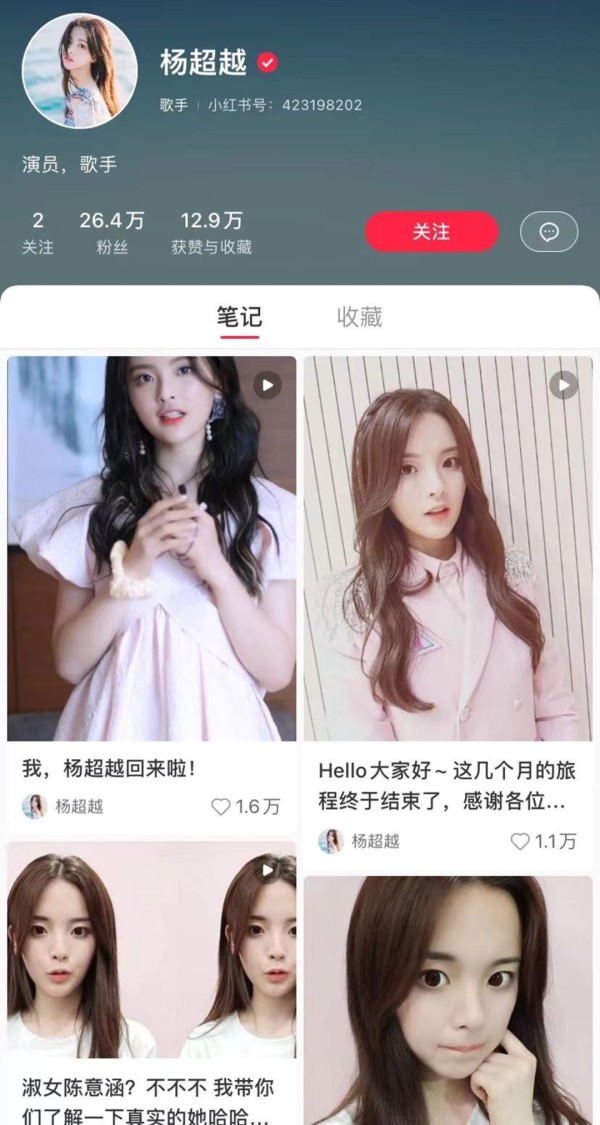 值得一提的是,杨超越是从小红书“迁徙”而来。在小红书上,她有26.4万粉丝,账号内20条视频多是其2019年参加综艺《创造101》时发布。当然在小红书上,杨超越不算是顶流明星。