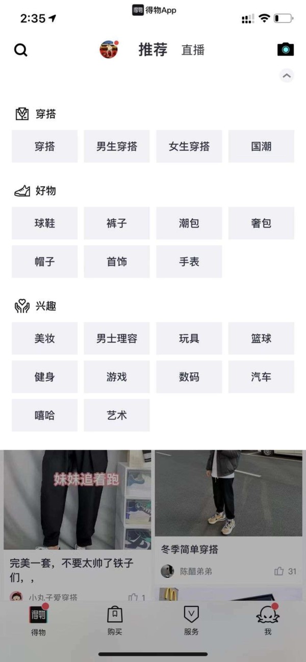 相较于刚成立时,得物社区已经迭代了多次。现在的社区以穿搭为核心,外扩垂类,共分为穿搭、好物、兴趣三大板块。