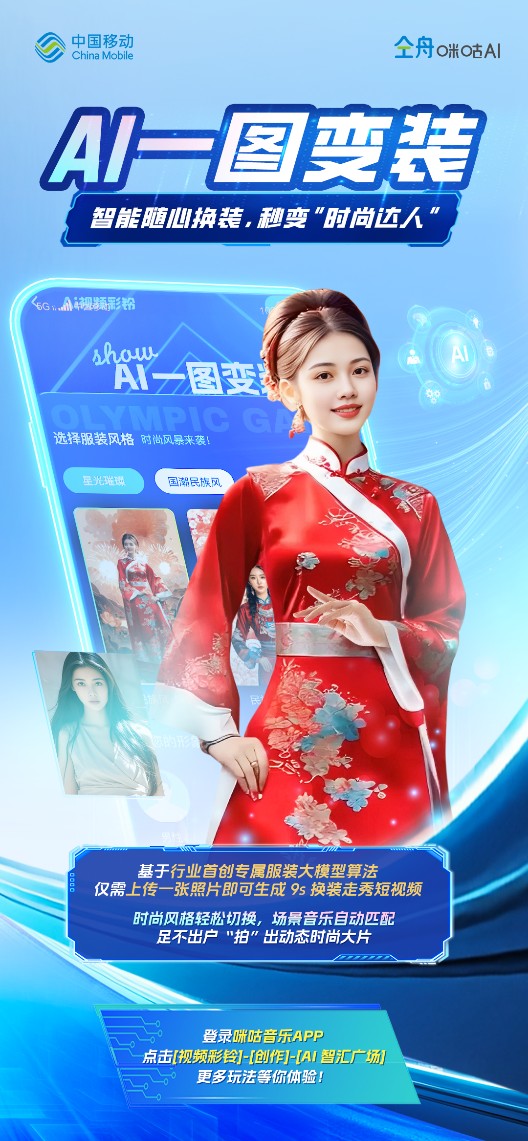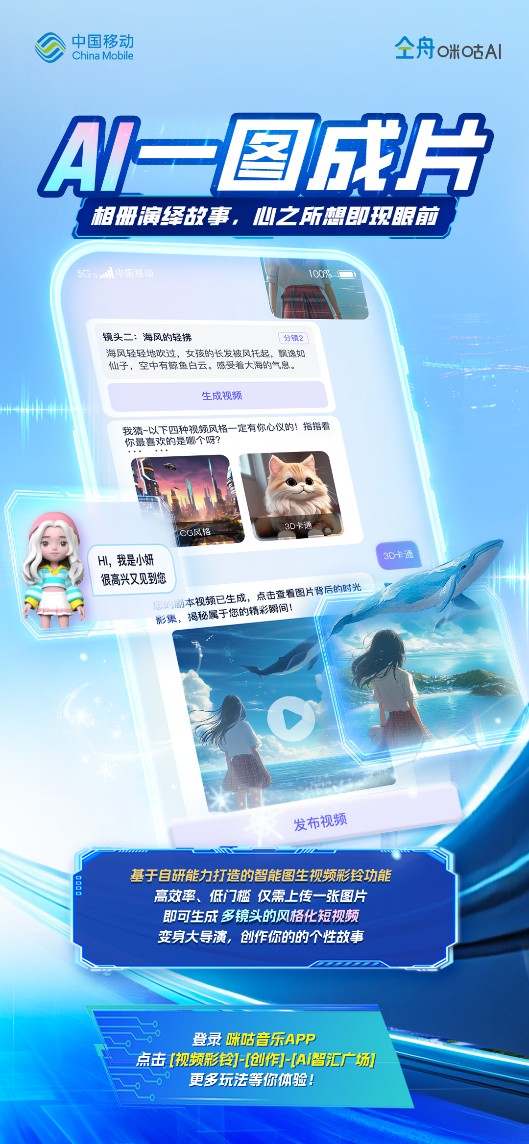依托技术领先优势,中国移动咪咕公司今年以来推出了“AI一语成歌”“AI一语成片”等AI视频彩铃创新产品,以AIGC应用赋能文生音乐、文生视频等AI创作,此次升级发布“AI一图变装”“AI一图成片”两大应用,进一步拓展了AI图生应用的创作新玩法,将为超4亿视频彩铃用户个性化创作带来全新的智创新体验。