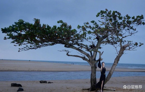王玉雯黑丝绒挂脖长裙配金属束腰,暗夜海边飘摆的裙摆营造“黑天鹅叙事感”。