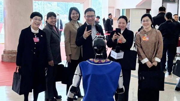 抵达会场的桂小Ai,立刻切换“专业模式”,标准播音腔同步上线,以广西云机器人记者和主持人的身份开启两会专属报道,与身旁的广西云记者搭档配合,默契开启现场探访,专业的姿态尽显报道功底。虽是首次以“机器人记者”身份参与广西两会报道,桂小Ai却快速进入工作状态,工作人员为其佩戴好工作证后,它便迅速进入正式报道状态,与身旁的广西云记者默契搭档开展现场探访,还与偶遇的代表委员友好互动,不少代表委员还主动上前与这位特殊的机器人记者合影留念,让科技感与履职氛围交融相映;在大会宣传展板前,它还配合广西云一线记者,简要解读展板上的两会重点宣传内容,向现场人员介绍广西发展亮点与两会核心议题,用专业又灵动的姿态传递智媒报道温度,每一个动作都贴合专业报道需求,又尽显科技萌趣,引得现场人员纷纷驻足,成为两会现场的“网红打卡点”。