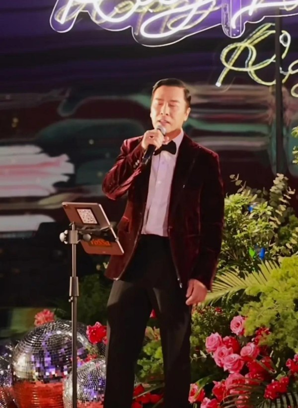 到场的宾客阵容,精准勾勒出了吕良伟的社交版图。 商界方面,英皇老板杨受成携夫人到场,尽管有报道提及英皇面临债务危机,但这并不影响杨老板在社交场上的活跃。 向华强和向太陈岚的现身更是重量级,向华强一身格子西装精神矍铄,向太则穿着中式华服,两人还上台为寿星献唱,关系可见一斑。 甄子丹作为铁哥们,不仅到场,还献唱了一首英文歌。 他一身酒红色丝绒西装,却被调侃站在吕良伟身边反而显得更沧桑,成了“保养翻车现场”。