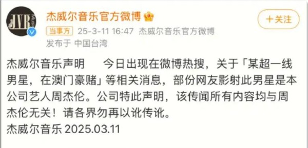 这次事件中,周杰伦又莫名其妙地“被豪赌10亿”,他的工作室不得不再次发声辟谣,呼吁大家不要以讹传讹,这次周杰伦躺枪实在属倒霉。