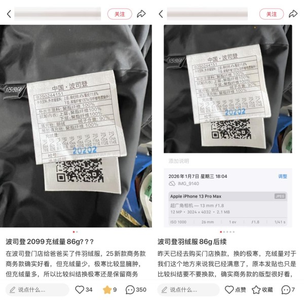 还有消费者花近七千元买了两件波司登极寒系列,购买时根本没关注充绒量,只觉得厚实、品牌靠谱。