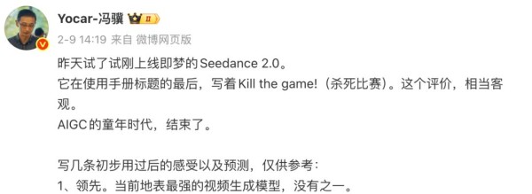 国内反响同样激烈, 游戏科学创始人、《黑神话:悟空》制作人冯骥给出“地表最强,没有之一” 的评 价, “我很庆幸,至少今天的Seedance 2.0,来自中国。”他表示。