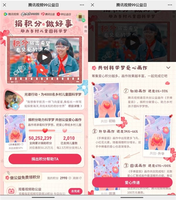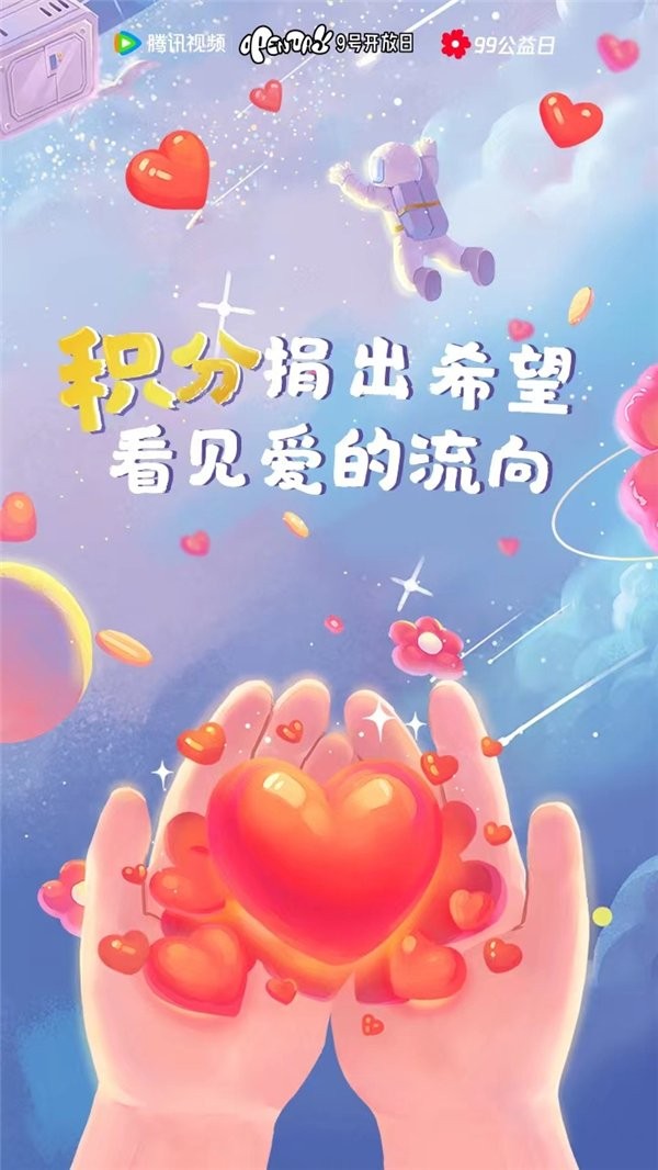 为加速孩子们的梦想成真,腾讯视频基于99公益日“一花一梦想”的全民共创公益交互机制,特别推出了“捐积分做好事”的活动专题,鼓励用户通过观看公益视频、参与公益答题、送出公益祝福的方式领取积分,一同浇铸孩子们的宝贵梦想。与此同时,腾讯视频还开启了共创科学梦爱心画作《手捧星辰》的活动,随着用户捐赠积分的累积,画作中的爱心元素将不断增加,在画作共创完成之后,腾讯视频也将为4000多位乡村孩子的科学梦捐出相应的善款,进一步传递人人公益的深远价值。