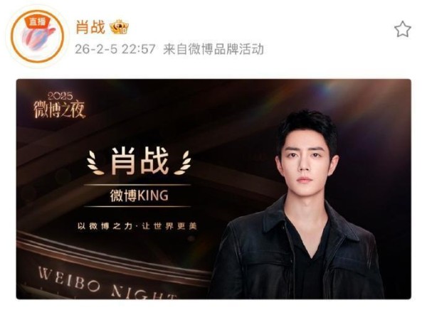 2026年微博之夜现场,肖战再次站在了聚光灯下。