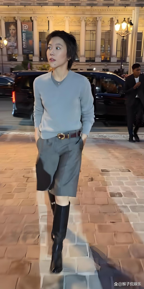 窦靖童在香奈儿红毯上的表现则展现了年轻一代的风格态度。灰色针织衫搭配五分西装短裤,脚踩黑色长靴,寸头造型让五官更显精致。她的风格不依赖繁复装饰,而是通过简约单品的组合传递出强烈的个人态度。与周迅同框时,她的英气与自信形成了独特的气场,这种 “简单而有态度" 的风格代表了新一代明星对时尚的理解。