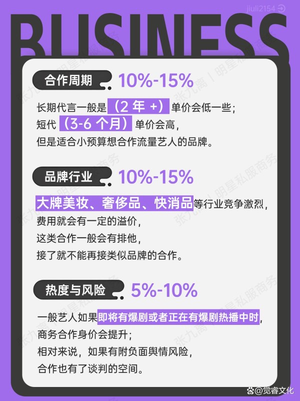 长期代言一般是(2 年 +)单价会低一些;短代(3-6 个月)单价会高,但是适合小预算想合作流量艺人的品牌。