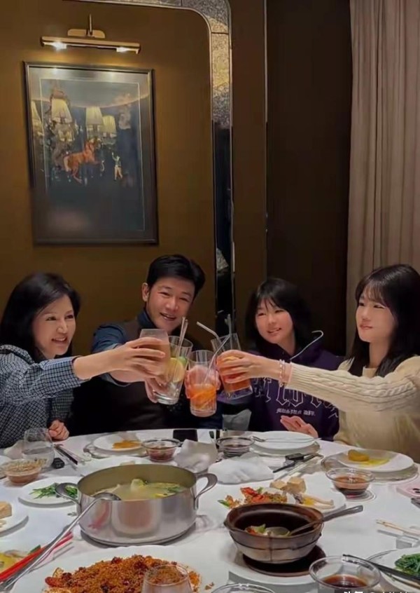 陆毅鲍蕾晒家庭聚餐,四人举杯迎接新年,两个女儿如花似玉陆毅一家聚会照曝光!鲍蕾与婆婆同坐亲如母女,陆妈妈看着好年轻