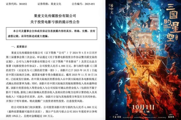 果麦文化曾参与出品了韩寒的四部电影。《四海》票房重创果麦文化后,果麦文化与亭东影业再牵手合作的电影是《三国的星空第一部》,结果票房再次重创了果麦文化。2025年12月2日,果麦文化发布了关于投资电影亏损的提示性公告,初步测算投资该影片的亏损约为人民币4000 万。