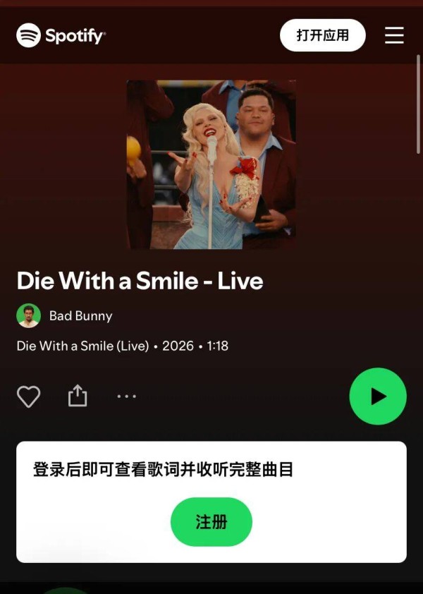 Lady Gaga 新单曲《Die With a Smile Live》在超级碗打单,可没想到上线首日 Spotify 上的播放量仅为9800 次,但近日涨了八倍,达到89072次。