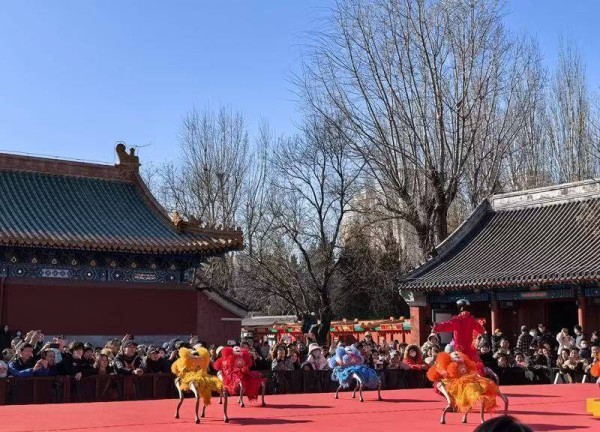 非遗传承与科技赋能的碰撞,是庙会的一大看点。广东潮響鼓社身着主题服饰演绎国家级非遗潮汕英歌舞,幡鼓齐动十三档、朝阳区东坝乡非遗金玲祖师及徐水舞狮等北方经典花会表演同步展演,内蒙古马头琴、川剧变脸等南北民俗技艺轮番登场,尽显非遗活态魅力。北顶娘娘庙内,机器人与仿生机器狗组成的祥狮战队献上“科技炫舞秀”,将人工智能与传统民俗深度融合,为古建庙宇注入新潮活力。