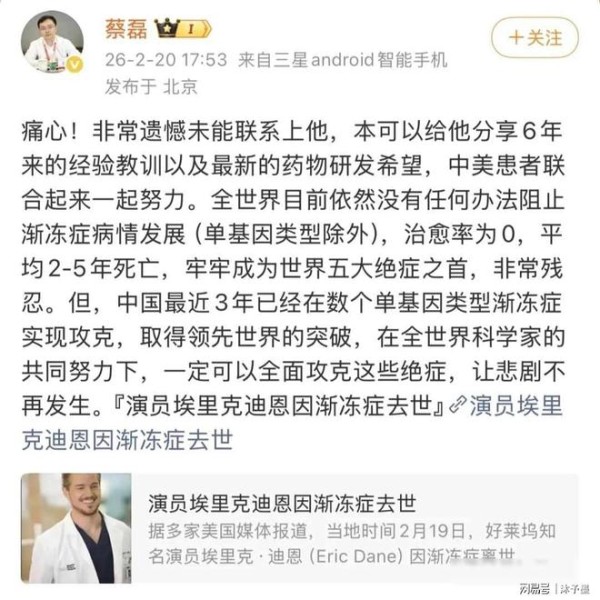 知名男演员因渐冻症去世!蔡磊发声
