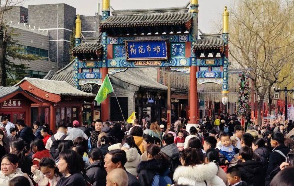 ▲古色古香的“荷花市场”牌楼之下,游客络绎不绝、摩肩接踵,处处洋溢着迎财神的喜庆氛围。