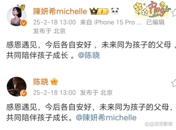 2025年2月18日,演员陈晓与陈妍希通过社交媒体同步发布离婚声明,宣布结束8年婚姻关系,表示“感恩遇见,今后各自安好”,并承诺将以父母身份共同抚养儿子“小星星”。声明中强调:“未来同为孩子的父母,共同陪伴孩子成长”,未提及财产分割细节,展现理性与温情并存的离婚姿态。