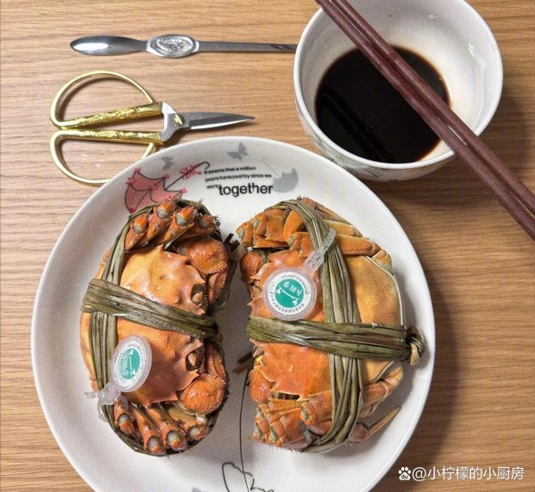 白鹿分享的螃蟹中,只有剪刀和小勺子,还有一碗醋。螃蟹看着很肥美,一定好吃。