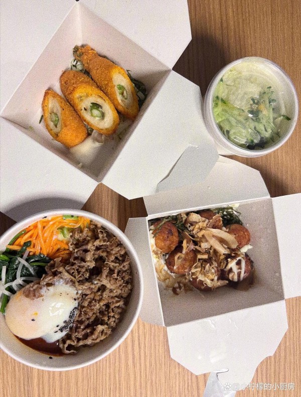 烤牛肉看起来像烤牛排,然后剪成一小块,看着还行。另外两个金黄色的盒子和红辣椒炒肉的盒子看不出来是什么美食,不过看着都不错的样子。