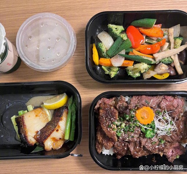 这一顿美食看起来像减肥餐,餐盒里面的鱼像鳕鱼,热量低营养高。减肥餐肯定少不了蔬菜,蔬菜餐盒里有西兰花、香菇、海鲜菇、秋葵、甜椒、胡萝卜、洋葱等蔬菜,看着挺好看的。还有一盒餐盒上面铺满了牛肉,下面是米饭,看着又香又美味。还有一小盒汤,看不出来是什么汤?