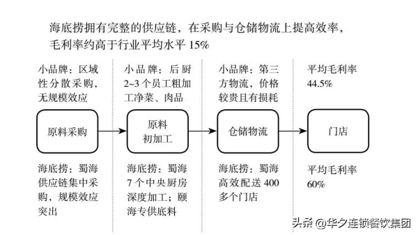 在连锁化方面,火锅行业虽然高度标准化、扩张性强,但进入门槛低,且分散化采购、配送成本高,很难建立竞争优势,因此,完整的供应链和严格的食品安全控制才是行业的核心壁垒。海底捞坚持采取直营的模式,加强品牌控制,并且构建了完整的火锅供应链,着力提升自身优势:底料统一来自颐海国际,原料采购、初加工、仓储物流均使用蜀海供应链(见图2-7)。截至2019年,蜀海供应链一共有7个中央厨房,最大限度地服务海底捞各区域门店,保证了产品的品质,降低了供应链成本。此外,海底捞形成了总部、教练、基于周边5~18家门店形成抱团小组和餐厅这四部分的扁平化组织架构,加强了门店端的管控。