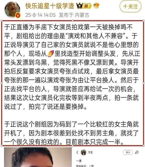 但圈内人心知肚明,这位导演“内定”风格早就被传开了。 去年的《云之羽》也传过类似的瓜,前脚刚宣布演员名单,后脚就被一阵操作换血,谁都说是“市场考虑”,但说白了还是看谁能进他的小圈子。 甚至有网友自嘲:“现在进组都得先投简历到导演的私人邮箱,没点‘关系简历’,门都摸不着。” 于正这次为什么要发声? 说好听点,是护犊子,说直白点,他手里新人刚有点苗头,眼看被人“潜规则”踹下去了,当然气不过。