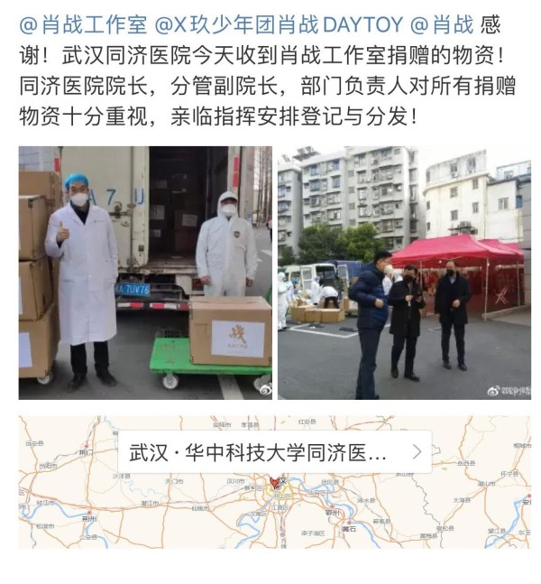 在此之前,肖战一直在网络上被黑,说他没有尽到身为偶像的责任和义务,没有对武汉进行捐助。肖战的粉丝感到十分委屈,一直在收集数据,证明肖战有为此次疫情捐款,虽然没走韩红的基金会,没走国家的基金会,但是,他确实捐了40万,而他的粉丝们,也受偶像号召,主动募集了钱款和物资进行捐赠。