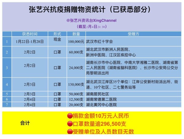 张艺兴公益一览表:捐款10万元,捐赠口罩超28万个