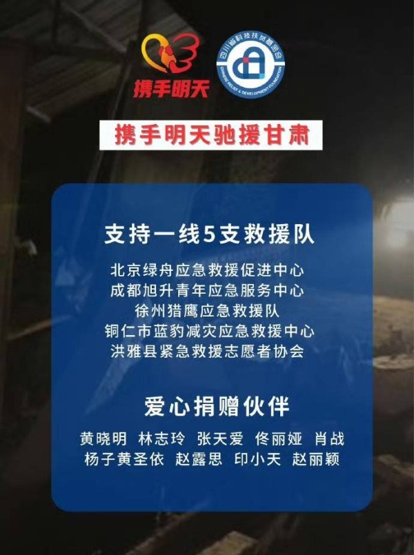 除了财政部与与应急管理部紧急预拨8.7亿救灾资金以外,民间也发挥力量赈灾,许多艺人明星如黄晓明、林志玲、张天爱、佟丽娅纷纷向灾区伸出援手,捐赠2000个家庭紧急救援物资包;韩红爱心慈善基金会也向甘肃省、青海省受灾地区捐赠878万元。