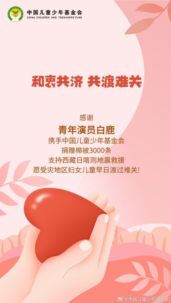 17:48,@中国儿童少年基金会 发文:感谢演员白鹿携手中国儿童少年基金会捐赠棉被3000条,支持西藏日喀则地震救援,愿受灾地区妇女儿童早日渡过难关。