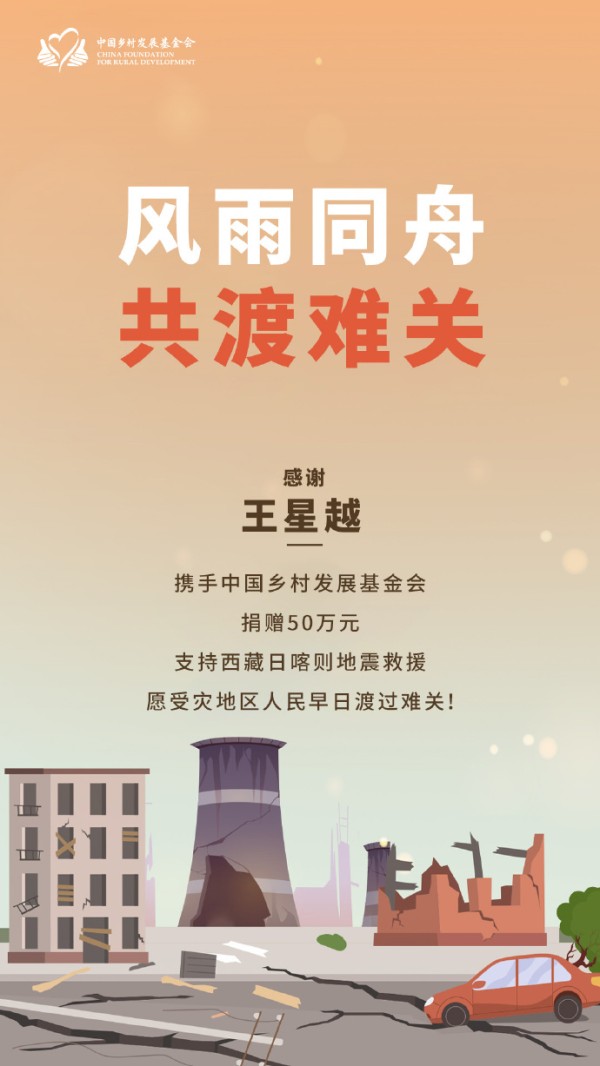 感谢王星越通过中国乡村发展基金会捐赠50万元。