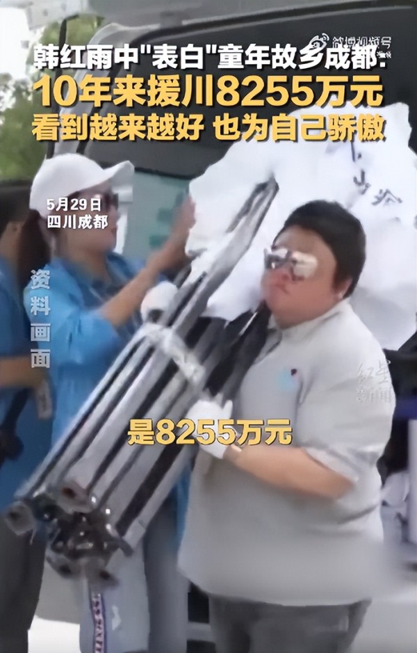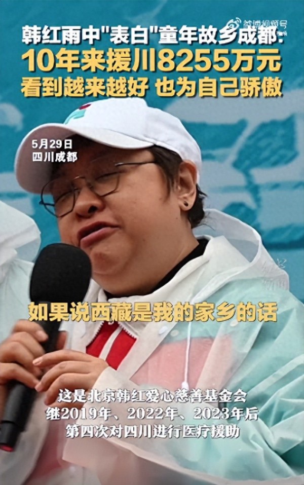 5月28日,据红星视频消息,韩红雨中“表白”童年故乡成都:“10年来援川8255万元,看到越来越好,也为自己骄傲。”