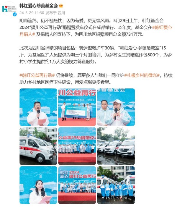 5月29日上午,韩红爱心慈善基金会公布2024“援川公益再行动”捐赠暨发车仪式现场图,透露2024年基金会在韩红爱心月捐人及捐赠人的支持下,为四川地区捐赠项目总金额731万元。