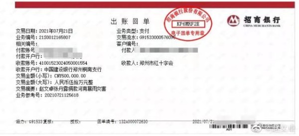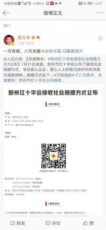 7月21日,演员赵文卓转发人民日报微博,表示与夫人张丹露一起向郑州红十字会捐款50万元,并配文“一方有难,八方支援”。