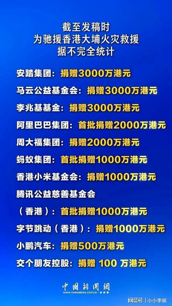 多位明星为香港火灾捐款!韩红基金拿出一千万,SM韩团捐出25万多位明星为香港火灾捐款,韩红基金捐100万