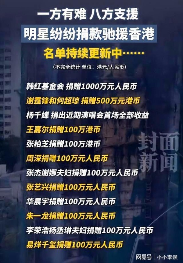 上百位明星为香港火灾捐款,黄晓明韩红等积极响应,最新捐款名单曝光