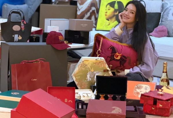 她还发了一张单人照,蹲在一堆新年礼盒中间,衣服还是聚会时那件。礼盒堆得像小山,有印小熊的,有烫金的,还有手写贺卡露出来一角。她笑得眼睛弯弯的,没修图,额角的细纹都能看清楚。这些礼物看样子都是聚会的朋友们送的,这种不带广告味、纯粹是老友心意的往来,在明星圈里其实挺难得的。