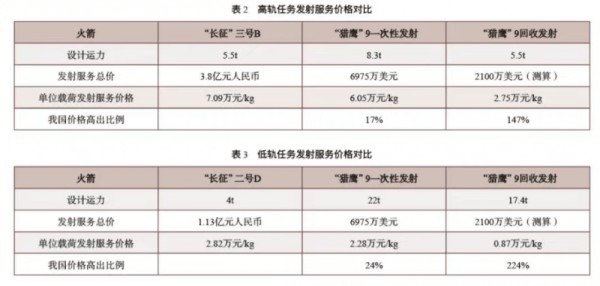 据《中国航天》研究数据显示,在低轨任务中,我国“长征二号D”的单位发射价格为2.82万元/kg。相比之下,“猎鹰9”的单位发射价格仅为0.87万元/kg,我国价格高出比例约224%。与此同时,该研究估算,随着中国的可回收火箭技术的成熟,未来成本预计将比SpaceX的“猎鹰9”便宜36%~49%。