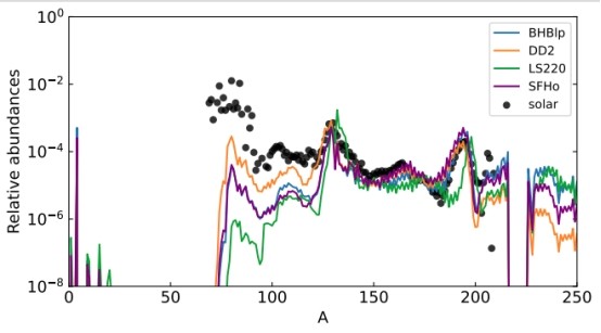 在这项工作中,我们使用来自不同状态方程的天体物理条件作为核合成输入,以探索各种状态方程对快中子捕获过程核合成和千新星发射的影响。我们的结果表明,合并喷射物的元素丰度(图1)和千新星光曲线(图2)都强烈依赖于中子星状态方程。给定两颗中子星的质量,较软状态方程的合并往往会产生更多的喷射物质,千新星光变曲线越亮,峰值光度越高(图 3)。中子星状态方程与峰值光度之间的关系为在中子星合并的多信使观测中约束状态方程的性质提供了一个探针。