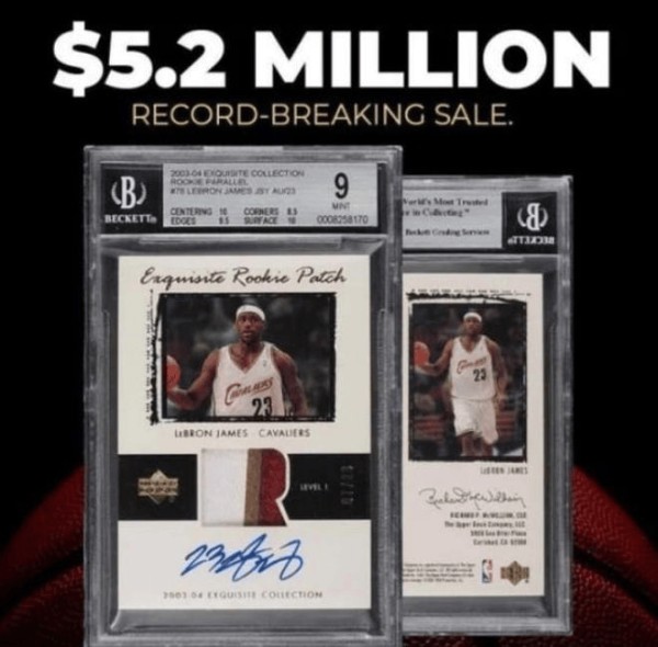 据了解,詹姆斯这款新秀卡当年仅发售23张(对应球衣号),这张被拍卖的球星卡是第14号,它既有亲签签名,还嵌入了詹姆斯新秀时期穿的球衣部分布料,并且整张卡片都保存完好。原本预估价是200万美元,成交价520万美元远远超出预期。也可见球星卡这类体育收藏品的热门程度。