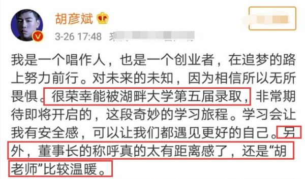 湖畔大学第五期学员名单公布,胡彦斌以董事长身份被录取,一时间火了整个娱乐圈。胡彦斌本人也是发动态表示:“董事长的称呼真的是太有距离感了,还是“胡老师”比较温暖”。听着胡彦斌叫出的“胡老师”三个字,网友也是大赞不已。