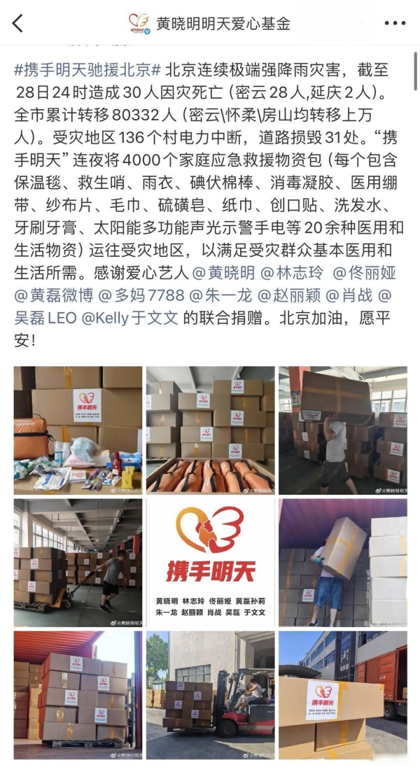 但黄晓明的人情经营并非无原则的讨好。从他在公益事业上的投入可以看出,他的善良和担当是发自内心的。2025年北京暴雨期间,他的“明天爱心基金”迅速行动,凌晨就协调好物流,把2000箱矿泉水送到受灾居民手里。这种高效执行力,建立在多年积累的信任网络之上。