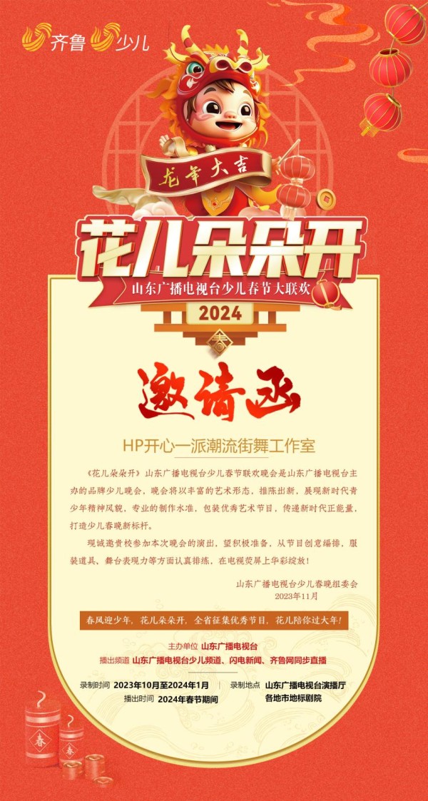 “花儿朵朵开”山东广播电视台少儿春晚节目征集活动在全省16地市展开,本次晚会将于2024年春节期间在山东广播电视台少儿频道、央广网双平台播出。HP开心一派潮流街舞工作室受“花儿朵朵开”山东广播电视台少儿春晚组委会邀请,参与少儿春晚的选拔、录制工作。