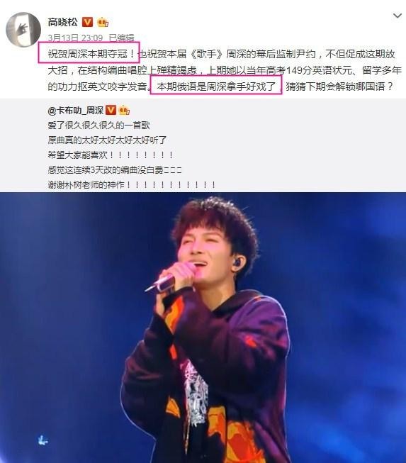 获知周深夺得第六周竞演头名的音乐人高晓松,第一时间对这位“小弟”送上了祝贺。当然,高晓松在这段文字中还提到了另外一个人名,监制尹约。