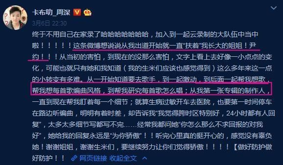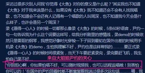 周深之前在个人社交平台上不是感慨过吗,说《大鱼》这首歌对他的意义到底意味着什么,看看他当时怎么说的,他把尹约称呼为大姐姐,一直在身旁扶着他,每每回忆这些,在周深的心里,每一次都是非常感动,感恩,在他的这份回忆录里,透过这些文字我们了解的,只要周深需要,尹约不管在何时何地做着何事,都会立刻出现。哪怕生病不舒服,也总会把周深的事情排在其先。
