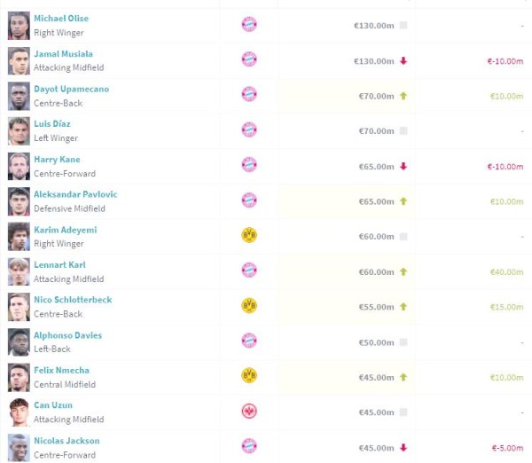 接着,我们来看看近期因伤愈复出而备受瞩目的贾马尔·穆西亚拉。这位拜仁慕尼黑的核心球员,在世俱杯后因严重伤病导致身价下调1000万欧元,目前为1.3亿欧元。尽管如此,他依然与队友迈克尔·奥利塞并驾齐驱,共同占据德甲身价榜的榜首位置。这无疑彰显了他在市场上的坚实地位,即便是在伤病期间,也依然保持着不可动摇的价值。