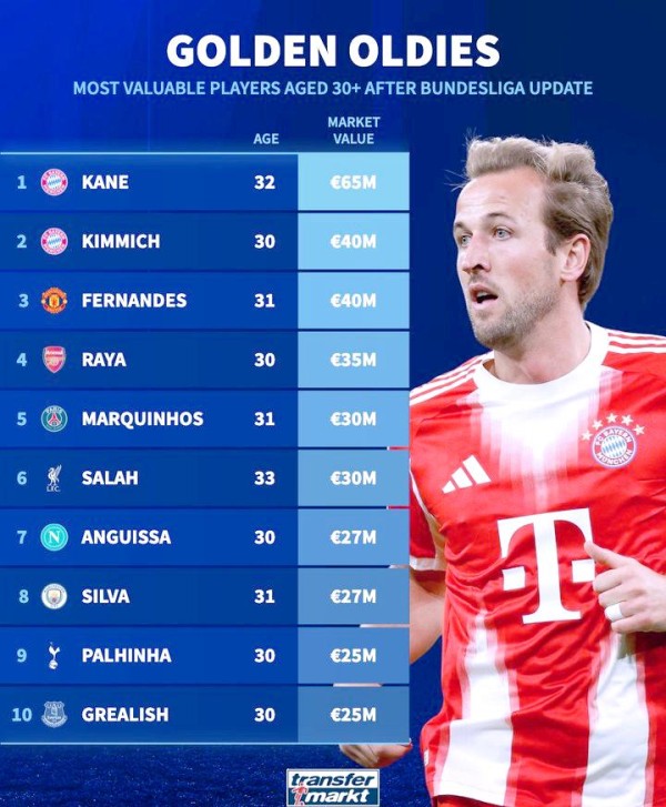 然而,这次身价下调并未撼动凯恩在同龄球员中的领先地位。在32岁及以上的球员身价排名中,他依旧稳坐榜首,且身价比萨拉赫高出3500万欧元。这一现象清晰地表明,尽管市场对年龄因素保持理性,但依旧对那些持续展现顶级水准的球员给予高度尊重。
