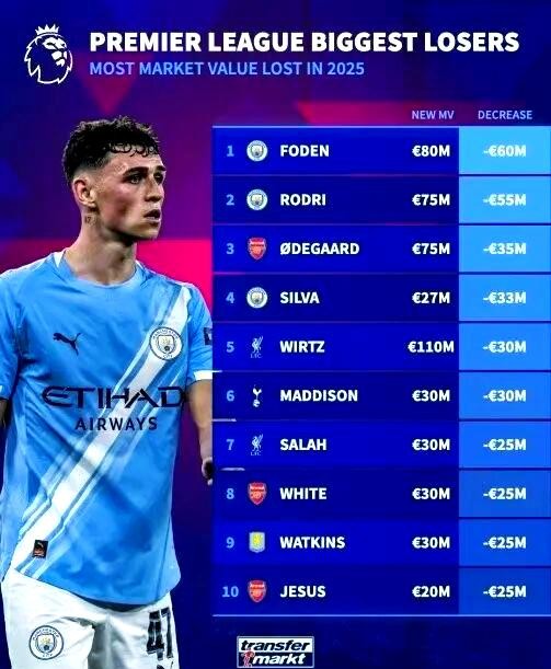 > 关键球员的变动福登(曼城,身价下降6000万,当前8000万)