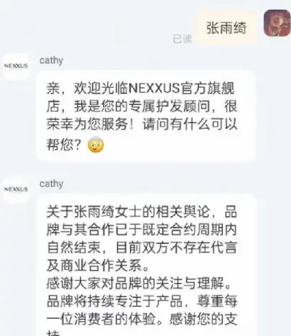 我特意点进一家护发品牌的官方旗舰,问客服张雨绮是不是还在代言。对方回复得很干脆,说合同早就结束了,现在双方没任何商务关系。那句“已于既定合约周期内自然结束”,语气虽然客气,但里面的温度很冷跟之前那些热推广告对比,落差非常明显。